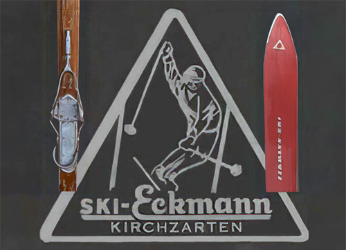 Metallschilder mit der Aufschrift „Ski Eckmann“ markieren erstmals die rechte Ski-Seite – ein Hinweis auf eine bereits etablierte eigene Marke.