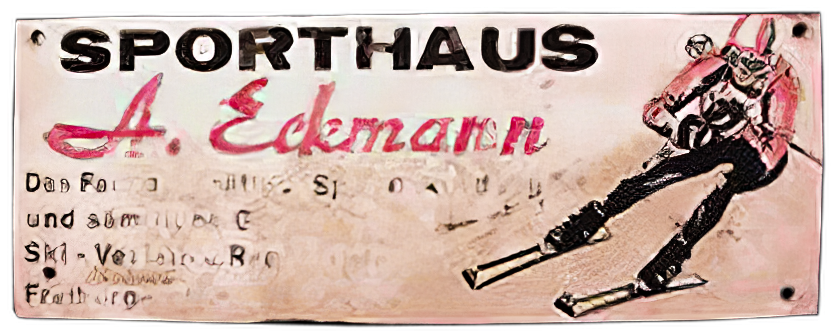 Metallschilder mit der Aufschrift „Ski Eckmann“ markieren erstmals die rechte Ski-Seite – ein Hinweis auf eine bereits etablierte eigene Marke.